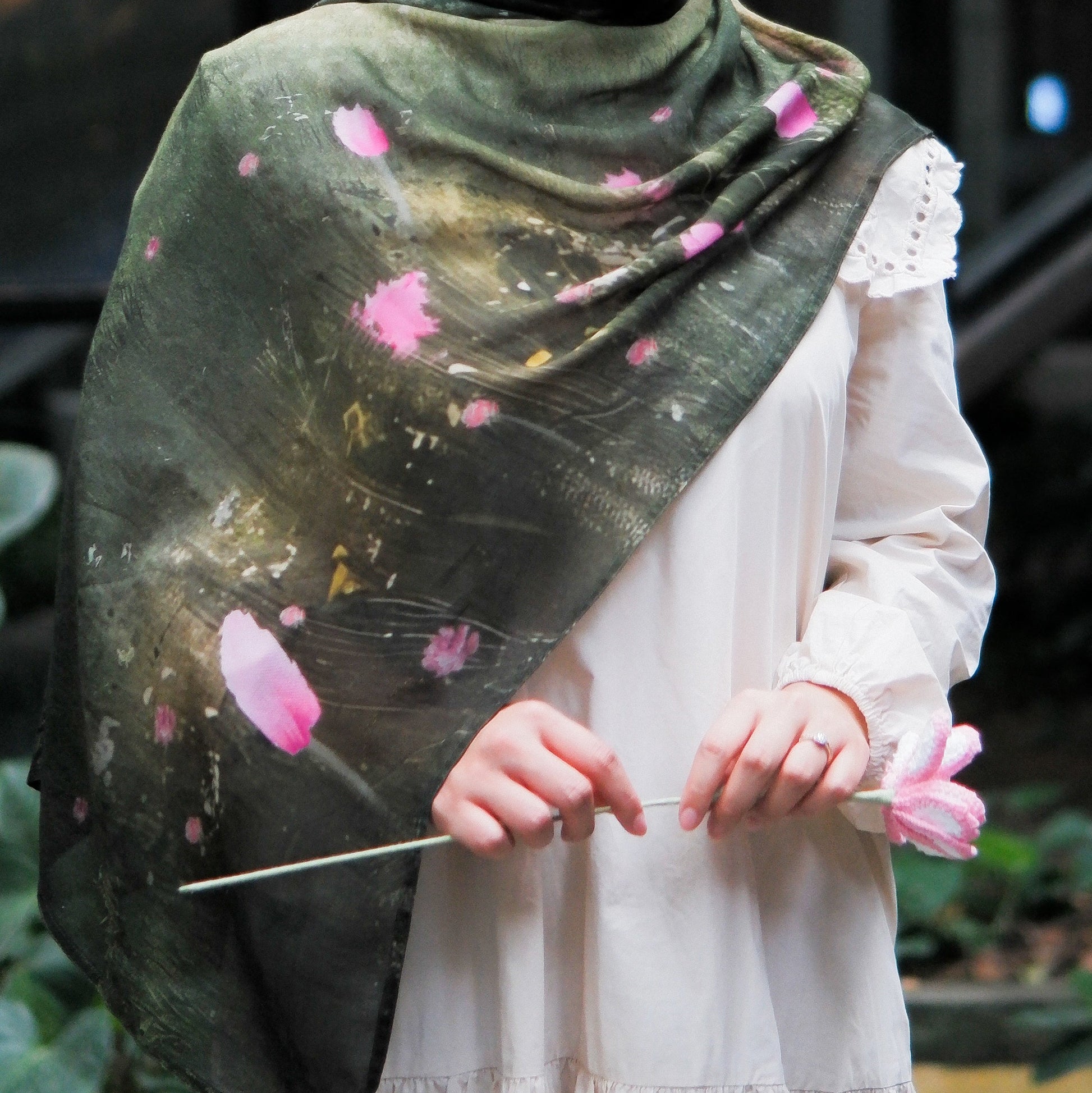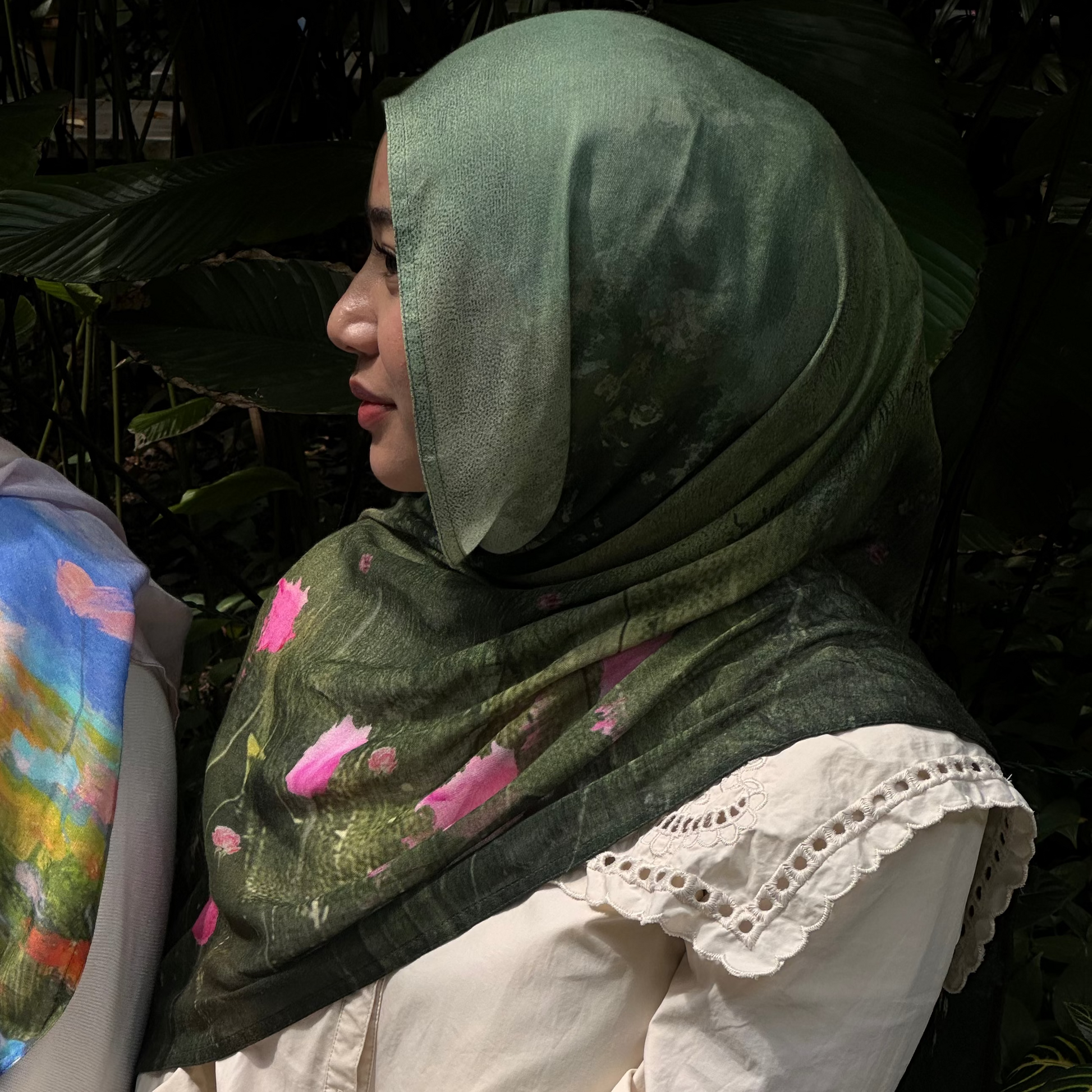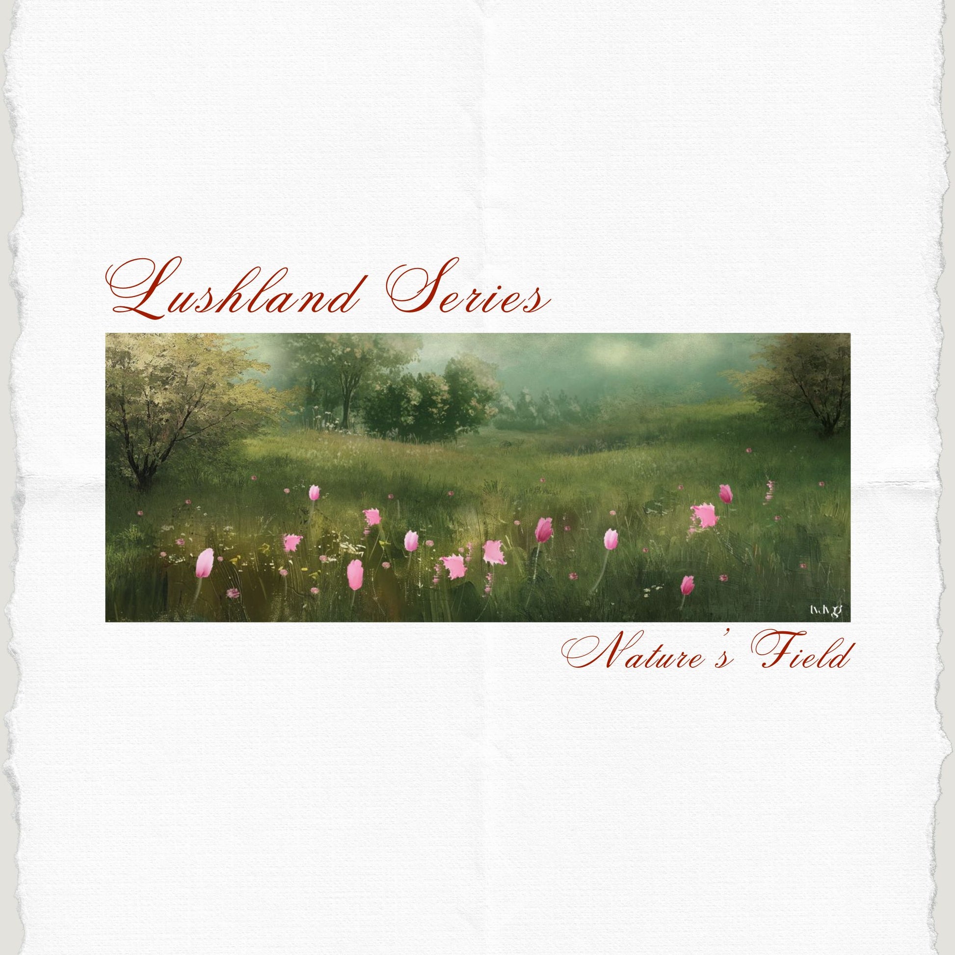 A broad green landscape accented by subtle pink blossoms placed across the open meadow.