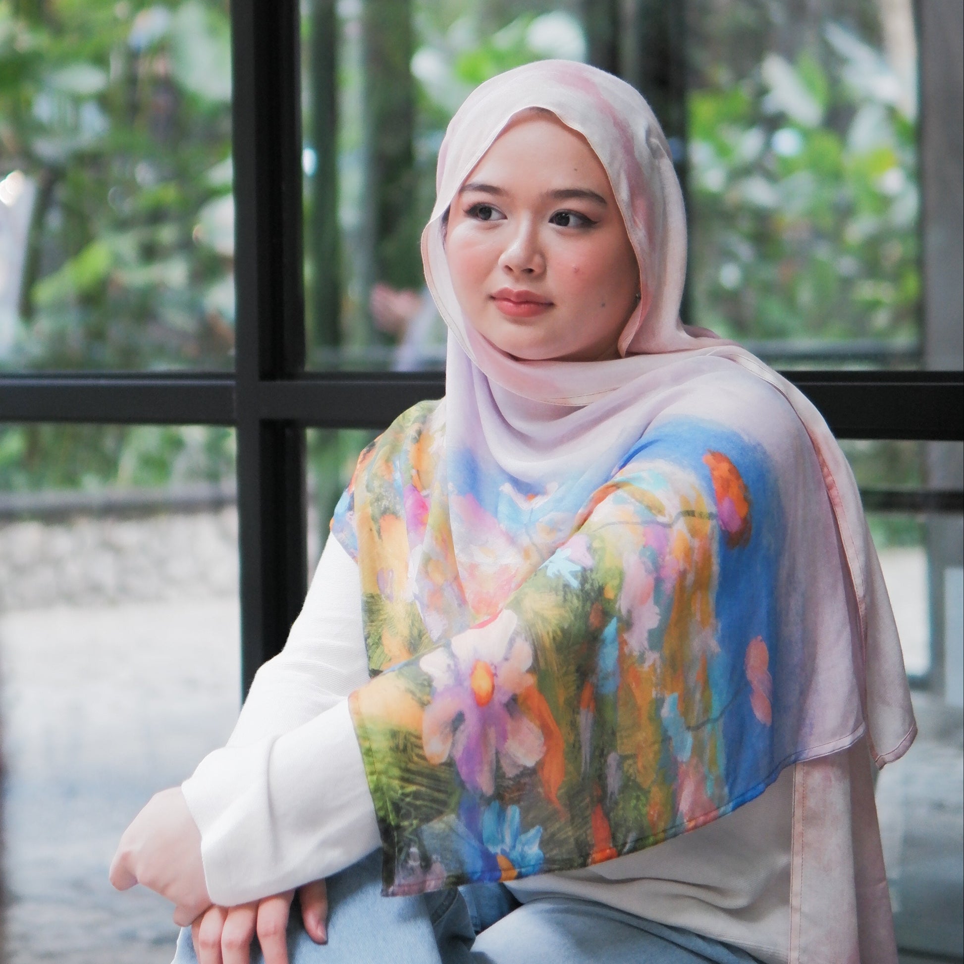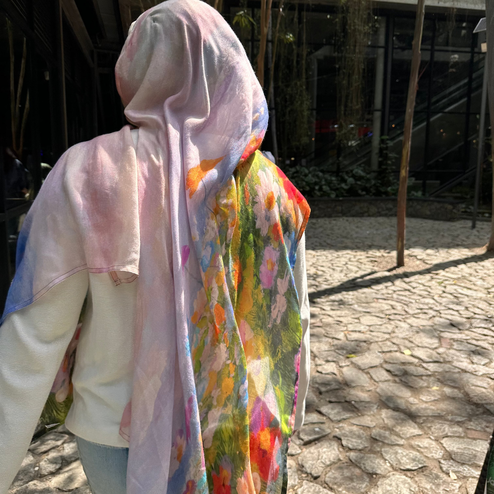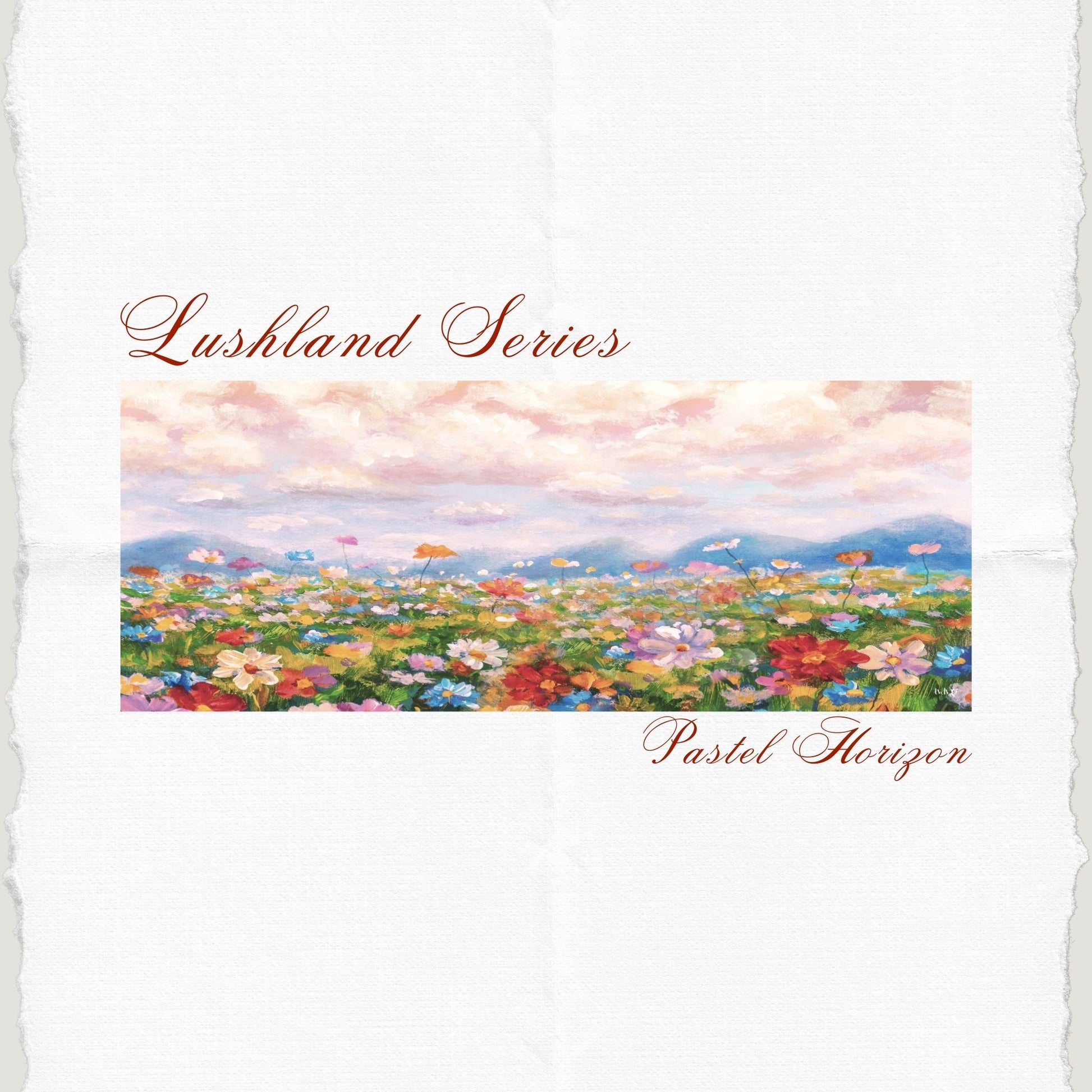 A dreamy landscape of colorful pastel flowers set beneath a soft pink and blue sky.